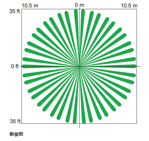 探測器安裝高度為 3 米(10 英尺)時(shí),探測范圍直徑為 15 米(50